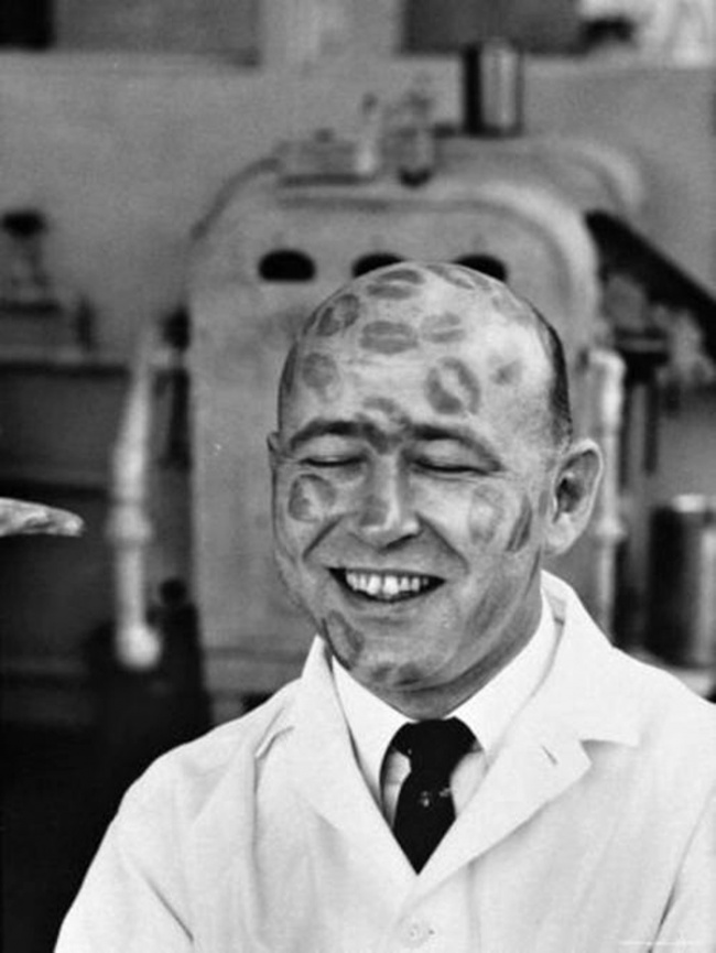 اختبار أحمر الشفاه عام 1950. كان أحد المصانع المنتجة لأحمر الشفاه يدعو بعض الرجال الذين لديهم صلع ليكونوا “دمى حية” يتم اجراء اختبار المنتجات عليها.