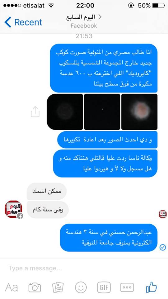 واستكمل الشخص الذي ادعى أن اسمه عبدالرحمن حسني، وأنه طالب في الفرقة الثالثة من كلية الهندسة الإلكترونية بجامعة منوف التي تقع في محافظة المنوفية، قائلا إنه قام بالتواصل مع وكالة ناسا الفضائية وأنهم وعدوه بالرد عليه بعد التأكد من صحة المعلومات التي أرسلها إليهم.