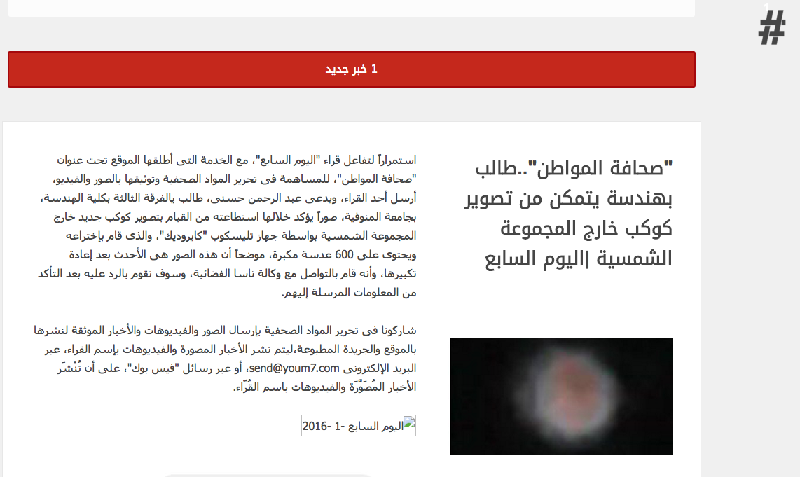 وقام موقع “اليوم السابع” بنشر الخبر، الذي أثار سخرية رواد مواقع التواصل الاجتماعي الذين أكدوا أنه من المستحيل أن يكون هناك تليسكوب يتم تركيبه فوق سطح منزل يستطيع أن يصور كوكبا عاديا، فضلا أن يكون الكوكب خارج المجرة، مشيرين إلى أن “عبدالرحمن حسني” كان يسخر من “اليوم السابع”، خاصة مع اسم التليسكوب الساخر “كايرو ديك” الذي يعني “خصية القاهرة”.