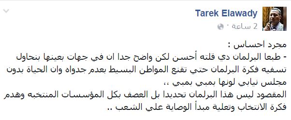 وقال “العوضي” في منشور له على حسابه في موقع “فيس بوك”: “طبعا البرلمان دي قلته أحسن، لكن واضح جدا إن في جهات بعينها بتحاول تسفيه فكرة البرلمان حتى تقنع المواطن البسيط بعدم جدواه وأن الحياة بدون مجلس نيابي لونها بمبي بمبي”.