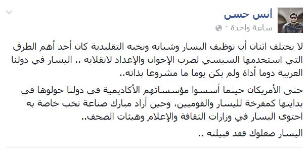 وقال “حسن” -في منشور له على حسابه في “فيس بوك”-: “لا يختلف اثنان أن توظيف اليسار وشبابه ونخبه التقليدية كان أحد أهم الطرق التي استخدمها السيسي لضرب الإخوان والإعداد لانقلابه”، مضيفًا “اليسار في دولنا العربية دومًا أداة ولم يكن يومًا ما مشروعًا بذاته”.