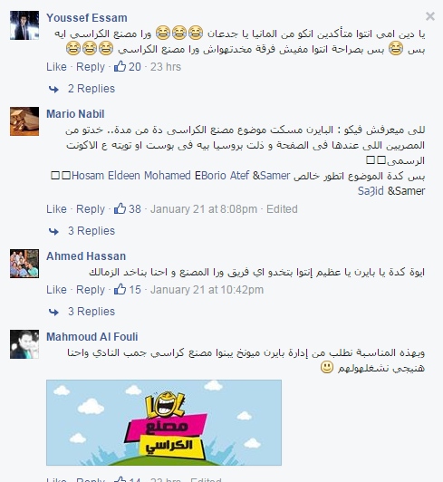 تفاعل رواد موقع التواصل الاجتماعي “فيس بوك”، مع الصفحة الرسمية لفريق بايرن ميونخ الألماني، والذين أرسلوا رسالة باللغة العربية إلى مشجعيه المصريين؛ حيث ظهر نجوم الفريق البافاري العالميون ماريو جوتزه وليفاندوفسكي وألابا وفرانك ريبري ونوير وغيرهم، في مقطع فيديو نشر الخميس 21 يناير 2016 بعنوان “ربما علينا أن نذكّركم بين الحين والآخر أين تجدون منافسي البايرن؟”، ليرد فيه اللاعبون باللغة العربية المثل المصري “ورا مصنع الكراسي”.(function(d, s, id) { var js, fjs = d.getElementsByTagName(s)[0]; if (d.getElementById(id)) return; js = d.createElement(s); js.id = id; js.src = “//connect.facebook.net/en_US/sdk.js#xfbml=1&version=v2.3”; fjs.parentNode.insertBefore(js, fjs);}(document, ‘script’, ‘facebook-jssdk’));