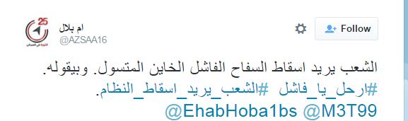 تصدَّر هاشتاج “#الشعب_ يريد_ إسقاط_ النظام” موقع التواصل الاجتماعي “تويتر” خلال الساعات الأولى من صباح اليوم السبت، وذلك قبل يومين من حلول الذكرى الخامسة لثورة 25 يناير، التي أطاحت بالرئيس المخلوع حسني مبارك.