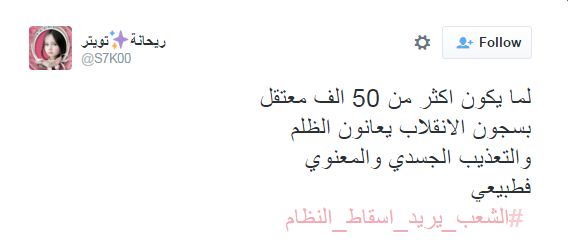 ريحانة تويتر: لما يكون أكثر من 50 ألف معتقل بسجون الانقلاب يعانون الظلم والتعذيب الجسدي والمعنوي فطبيعي الشعب يريد إسقاط النظام.
