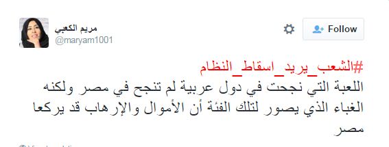 وقالت مريم الكعبي: اللعبة التي نجحت في دول عربية لم تنجح في مصر، ولكنه الغباء الذي يصور لتلك الفئة أن الأموال والإرهاب قد يركعا مصر.