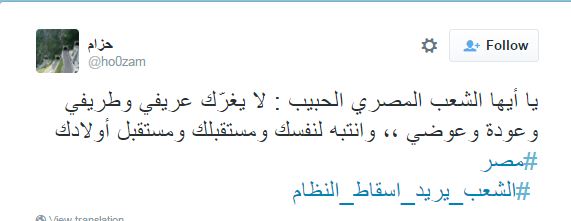 حزام: يا أيها الشعب المصري الحبيب: لا يغرّك عريفي وطريفي وعودة وعوضي، وانتبه لنفسك ومستقبلك ومستقبل أولادك
