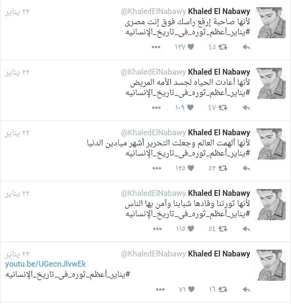 أطلق الممثل المصري خالد النبوي هاشتاجا يحمل اسم #ثورة_يناير_أعظم_ثورة_في_تاريخ_الإنسانية، وذلك عبر حسابه في موقع التدوينات المصغرة “تويتر”، وذلك قبل أيام قليلة من حلول الذكرى الخامسة لثورة 25 يناير.