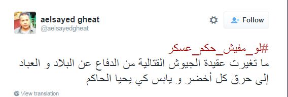 aelsayed gheat: “ما تغيرت عقيدة الجيوش القتالية من الدفاع عن البلاد والعباد إلى حرق كل أخضر ويابس كي يحيا الحاكم”.