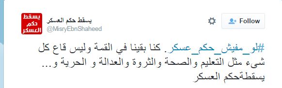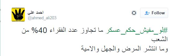 دشن مغردون عبر مواقع التواصل الاجتماعي “تويتر”، هاشتاج #لو_مفيش_حكم_عسكر، أعربوا خلاله عن توقعاتهم كيف تكون مصر وشعبها في حالة إنهاء الحكم العسكري؛ حيث يأتي ذلك بالتزامن مع حلول الذكرى الخامسة لثورة 25 يناير.