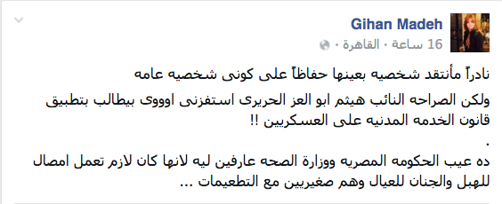 وكتبت -على صفحتها الشخصية على موقع التواصل الاجتماعي “فيس بوك”-: “نادرًا ما أنتقد شخصية بعينها حفاظًا على كوني شخصية عامة، ولكن الصراحة النائب هيثم أبو العز الحريري استفزني أوي، بيطالب بتطبيق قانون الخدمة المدنية على العسكريين”.