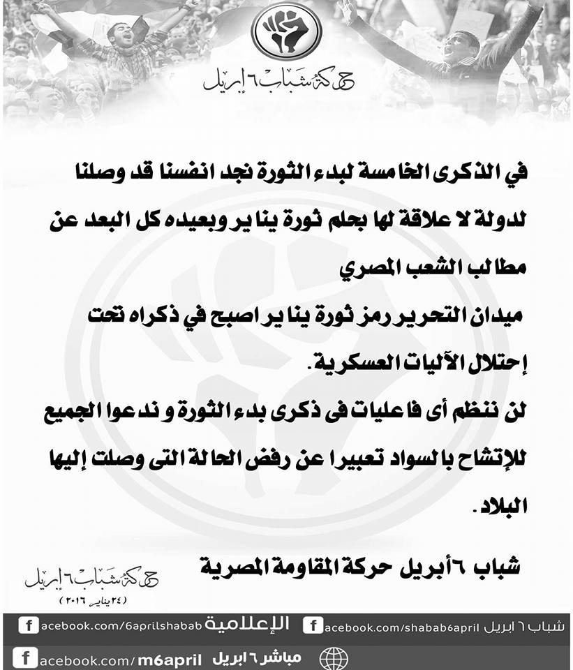 نشرت حركة شباب 6 أبريل بيانا إعلاميا، عبر الصفحة الرسمية للحركة بموقع التواصل الاجتماعي “فيس بوك”، قبل الذكرى الخامسة لثورة الخامس والعشرين من يناير بساعات قليلة.