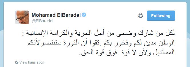 وقال البرادعي في تغريدته: “لكل من شارك وضحى من أجل الحرية والكرامة الإنسانية: الوطن مدين لكم وفخور بكم.. ثقوا أن الثورة ستنتصر لأنكم المستقبل ولأن لا قوة فوق قوة الحق”.