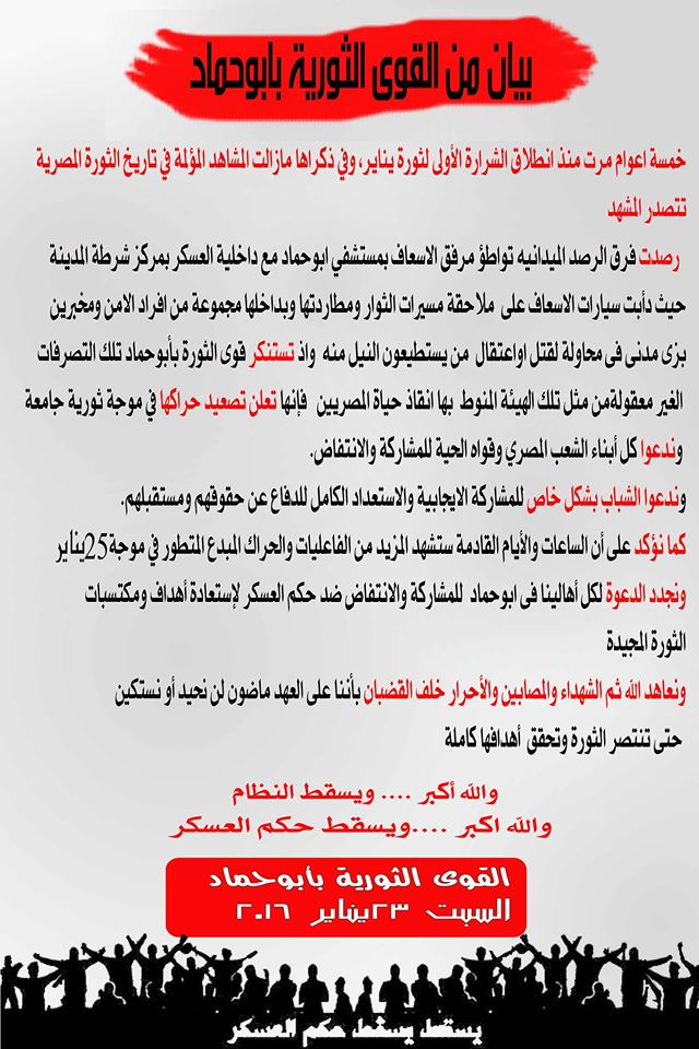 كما دعا البيان جماهير الشباب إلى المشاركة الإيجابية في الحراك القادم في ذكرى 25 يناير والانتفاض ضد حكم العسكر، حسب البيان.