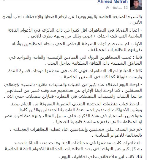 أكد الناشط الحقوقي، أحمد مفرح “أن أعداد الضحايا في التظاهرات كانت أقل كثيرًا من الذكرى ذاتها في الأعوام الثلاثة الماضية التي تلت أحداث 30 يونيو”.
