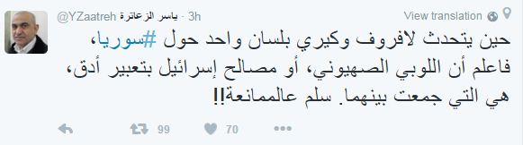 وتابع: “حين يتحدث لافروف وكيري بلسان واحد حول سوريا، فاعلم أن اللوبي الصهيوني، أو مصالح “إسرائيل” بتعبير أدق، هي التي جمعت بينهما.. سلم عالممانعة!!“.
