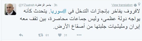 أضاف “الزعاترة” -عبر “تويتر”- “لافروف يفاخر بإنجازات التدخل في سوريا يتحدث كأنه يواجه دولة عظمى، وليس جماعات محاصرة، بينما تقف معه إيران ومليشيات جلبتها من أصقاع الأرض”.