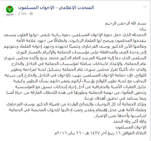 وجاء البيان: “انطلاقا من جهود علامة الأمة وعالمها الأبرز الدكتور يوسف القرضاوي وتثمينًا لجهوده وجهود إخوانه العلماء ودعوتهم إلى وحدة الصف والمحافظة على مؤسسات الجماعة والالتزام بالمسار الثوري السلمي الذي دعا إليه فضيلة المرشد العام الدكتور محمد بديع وأكده مجلس شورى عام الجماعة فإن جماعة الإخوان المسلمين تهيب بالإخوان في الداخل والخارج إلى سرعة التجاوب مع لجنة تطوير اللوائح وإرسال آرائهم ومقترحاتهم بشأن التطوير وكيفية تذليل العقبات الأمنية والجغرافية من أجل إجراء انتخابات تتسق مع المؤسسية وتحقق المأمول من نهضة الجماعة وتطورها في هذه اللحظات الفارقة من حياة أمتنا وبما يساعد في تحقيق أهداف ثورتنا”.