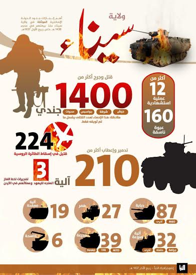 نشر تنظيم الدولة إنفوجرافيك كاملا عن جميع عملياته في سيناء ضد الجيش المصري، وحصد عدد القتلى والجرحى في صفوف الجيش وتفجير الآليات العسكرية كالتالي: