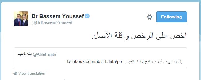 وقال “يوسف” في تغريدته معلقا على بيان “أبلة فاهيتا” بعد أن نشره: “اخص ع الرخص وقلة الأصل”.
