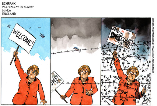 وعن رد فعل أنجيلا ميركل من قضية اللاجئين العرب نشرت صحيفة “نيويورك تايمز” هذا الرسم:
