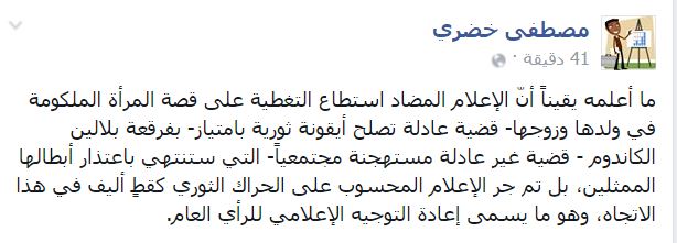 وقال “خضري” -عبر منشور له على “فيس بوك”-: “ما أعلمه يقينًا أنّ الإعلام المضاد استطاع التغطية على قصة المرأة المكلومة في ولدها وزوجها -قضية عادلة تصلح أيقونة ثورية بامتياز- بفرقعة بلالين الكاندوم -قضية غير عادلة مستهجنة مجتمعيًا- التي ستنتهي باعتذار أبطالها الممثلين”.