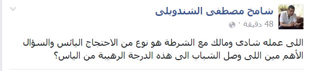 وقال “الشندويلي” في منشور له على حسابه في “فيس بوك”: “اللي عمله شادي ومالك مع الشرطة هو نوع من الاحتجاج اليائس والسؤال الأهم مين اللي وصَّل الشباب إلى هذه الدرجة الرهيبة من الياس؟“.