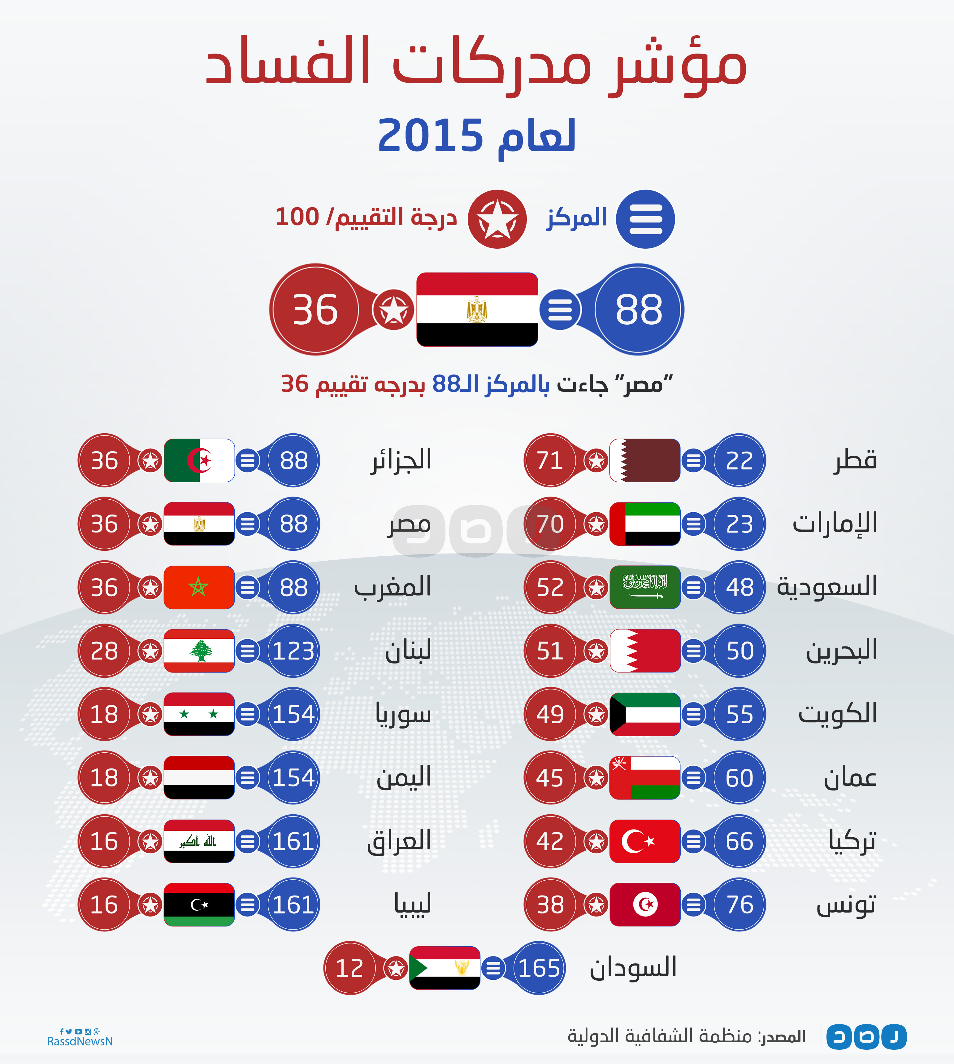 أظهر مؤشر الفساد العالمي، الصادر عن منظمة “الشفافية الدولية”، وقوع مصر بالمرتبة الـ88، من بين 168 دولة على مستوى العالم، إذ احتلت المركز الأول دولة الدنمارك بدرجة تقييم 91 من 100 بمؤشر الـcpi 2015.