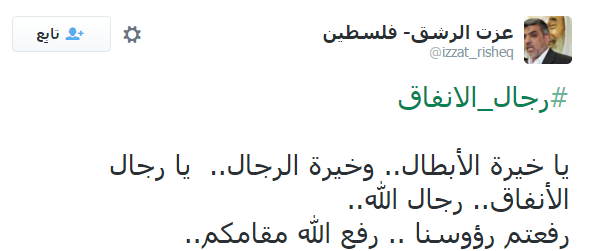 وقال عضو المكتب السياسي لحركة حماس عزت الرشق عبر حسابه على موقع التواصل الاجتماعي “تويتر ” يا خيرة الأبطال، وخيرة الرجال، يا رجال الأنفاق، رجال الله رفعتم رؤوسنا، رفع الله مقامكم”.