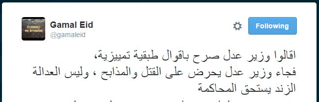 ونشر عيد تغريدة عبر حسابه الشخصي بموقع التغريدات القصيرة “تويتر”، ذكر فيها أن الحكومة المصرية أقالت وزير العدل الأسبق لتصريحاته العنصرية، لتأتي بوزير آخر يحل محله ويحرض على العنف والقتل.