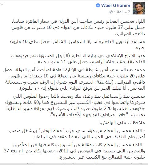 وقال “غنيم” في منشور له على “فيس بوك”: “اللواء محسن الفحام، رئيس مباحث أمن الدولة في مطار القاهرة سابقًا، حصل على 37 مليون جنيه مكافآت من الدولة في 10 سنوات من فلوس دافعي الضرائب، ومساعد أول وزير الداخلية سابقًا إسماعيل الشاعر، حصل على 10 مليون جنيه“.