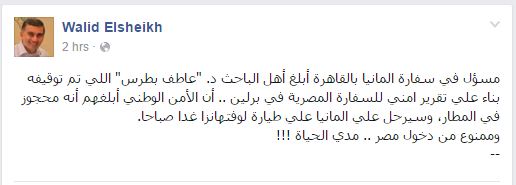 وتابع في تدوينه أخرى أن:”مسؤل في سفارة المانيا بالقاهرة أبلغ أهل الباحث د. “عاطف بطرس” اللي تم توقيفه بناء علي تقرير امني للسفارة المصرية في برلين .. أن الأمن الوطني أبلغهم أنه محجوز في المطار، وسيرحل علي المانيا علي طيارة لوفتهانزا غدا صباحا.