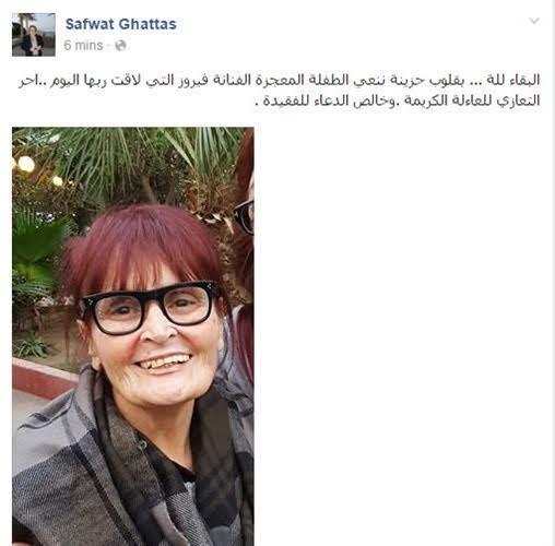 كتب المنتج صفوت غطاس الخبر- عبر منشور له على صفحته الشخصية على “فيسبوك”: “البقاء لله.. بقلوب حزينة ننعى الطفلة المعجزة الفنانة فيروز، التي لاقت ربها اليوم.. أحر التعازي للعائلة الكريمة، وخالص الدعاء للفقيدة”.