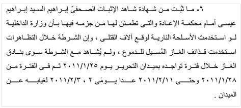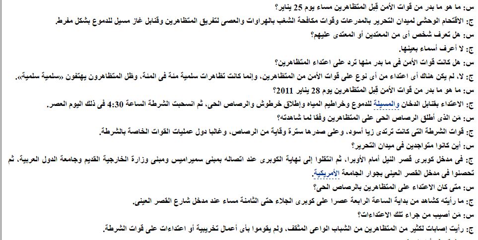 س: مَن الذى أطلق الرصاص الحي على المتظاهرين وفقًا لما شاهدته؟ ج: قوات الشرطة التى كانت ترتدى زيًا أسود، وعلى صدرها سترة وقاية من الرصاص، وغالبًا دول عمليات القوات الخاصة بالشرطة.