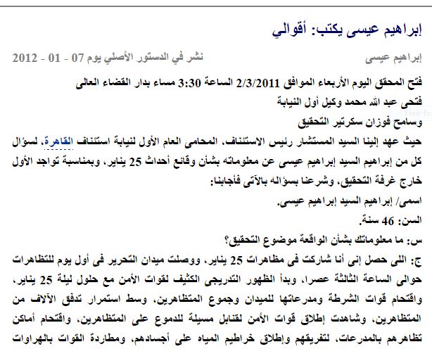 س: متى كان الاعتداء على المتظاهرين بالرصاص الحى؟ ج: ما رأيته كشاهد من بداية الساعة الرابعة عصرًا على كوبرى الجلاء حتى الثامنة مساء عند مدخل شارع القصر العينى”.
