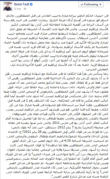 وأوضح “فضل” في منشور له بصفحته بموقع التواصل الاجتماعي “فيس بوك” أن إبراهيم عيسى أكد بعد أدائه القسم أن الشرطة لم تطلق النار على المتظاهرين، مشيرًا إلى أن محامي مبارك فريد الديب ومحامي حبيب العادلي استطاعوا استغلال هذه الشهادة أحسن استغلال، بسبب تأكيدهم معارضة إبراهيم عيسى الشرسة لمبارك واشتراكه الأكيد في الثورة منذ بدايتها؛ مما يجعل شهادته ذات أهمية خاصة.