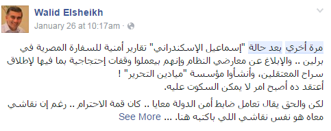 وقال “وليد” في منشورعلى صفحته على فيسبوك “مرة أخري بعد حالة “إسماعيل الإسكندراني” تقارير أمنية للسفارة المصرية في برلين .. والإبلاغ عن معارضي النظام وإنهم بيعملوا وقفات إحتجاجية بما فيها ﻹطلاق سراح المعتقلين، وأنشأوا مؤسسة “ميادين التحرير” !» مضيفا “أعتقد ده أصبح أمر لا يمكن السكوت عليه”.