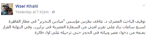 وقال “خليل” في منشور له على حسابه بموقع التواصل الاجتماعي فيس بوك”: “توقيف الباحث المصري د. عاطف بطرس مؤسس “ميادين التحرير” في مطار القاهرة لسبع ساعات بناء علي تقرير امني من السفارة المصرية في برلين.. وفي النهاية القرار بمنعه من دخول مصر وبياته في الحجز حتى ترحيله علي اول طائرة”.