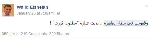 وكتب الشيخ على حسابه على موقع التواصل الاجتماعي فيس بوك : وقفوني في مطار القاهرة .. تحت عبارة “مطلوب فوري” ! ثم انقطعت أخباره بعدها تماما.