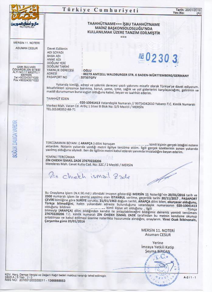 1- يمكن للسوري الحاصل على إقامة في تركيا تنظيم طلب دعوة لدى الكاتب بالعدل “النوتر” لأي شخص من أقاربه أو غير أقاربه، ويوجهها إلى القنصلية التركية مكان وجود الشخص طالب الفيزا المدعو، ويجب أن تتضمن تلك الدعوة: