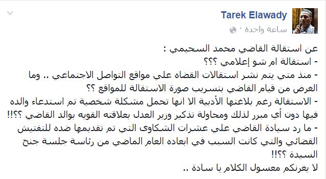 وقال “العوضي” في منشور له على حسابه بموقع التواصل الاجتماعي “فيس بوك”: “الاستقالة رغم بلاغتها الأدبية إلا أنها تحمل مشكلة شخصية تم استدعاء والده فيها دون أي مبرر لذلك ومحاولة تذكير وزير العدل بعلاقته القوية بوالد القاضي؟؟!!“.