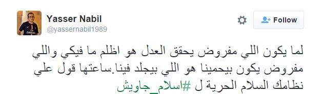 Yasser Nabil: “لما يكون اللي مفروض يحقق العدل هو أظلم ما فيكي واللي مفروض يكون بيحمينا هو اللي بيجلد فينا، ساعتها قول علي نظامك السلام”.