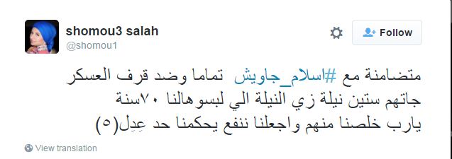 shomou3 salah: “متضامنة مع اسلام جاويش تماما وضد قرف العسكر جاتهم ستين نيلة زي النيلة الي لبسوهالنا ٧٠سنة، يارب خلصنا منهم واجعلنا ننفع يحكمنا حد عِدِل”.