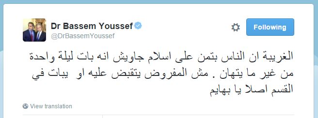 سخر مقدم البرامج الساخر باسم يوسف، من وزارة الداخلية عقب إخلاء سبيل رسام الكاريكاتير إسلام جاويش، وذلك من خلال تغريدة نشرها عبر حسابة الشخصي بموقع التغريدات القصيرة “تويتر”.