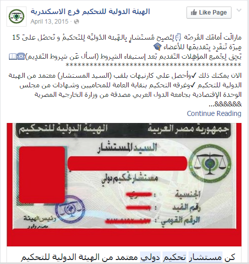 “معنا تحصل على لقب مستشار تحكيم دولي مقابل 350 جنيها”.. إعلان قد تجده على مواقع التواصل الاجتماعي، أو على لافتة فى الشوارع والميادين والجامعات والنوادي، والتي تدعو أصحاب المؤهلات المتوسطة والمحامين وخريجي الحقوق للالتحاق بدورة لمدة من بين ثلاثة أيام وسبعة أيام يحصل بعدها المشترك على لقب محكم دولي وقاضٍ اتفاق وهيئة محلفين للترافع فى قضايا التحكيم التجارى.