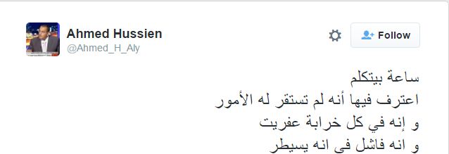 Ahmed Hussien-: “ساعة اعترف فيها أنه لم تستقر له الأمور، وإنه في كل خرابة عفريت، وإنه فاشل في إنه يسيطر”.