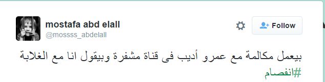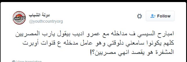 youthcountryorg-: “امبارح السيسي في مداخلة مع عمرو أديب بيقول يارب المصريين كلهم يكونوا سامعني دلوقتي وهو عامل مداخلة على قنوات أوربت المشفرة.. هو يقصد أنهي مصريين؟!”.