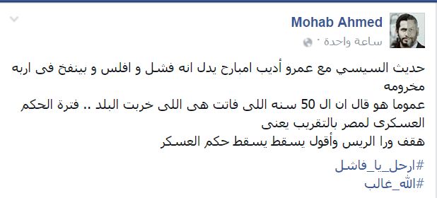 Mohab Ahmed-: “حديث السيسي مع عمرو أديب امبارح يدل انه فشل وأفلس وبينفخ في قربة مخرومة، عموما هو قال إن الـ 50 سنة اللي فاتت هي اللي خربت البلد .. فترة الحكم العسكري لمصر بالتقريب يعني هقف ورا الريس وأقول يسقط يسقط حكم العسكر”. .jpeg)