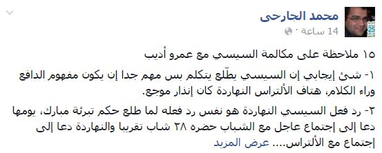 كتب محمد الجارحي، رئيس تحرير برنامج “مانشيت” لدى قناة “أون تي في”، 15 ملاحظة على اتصال السيسي بعمرو أديب، عبر صفحته على “فيس بوك”، وهي: