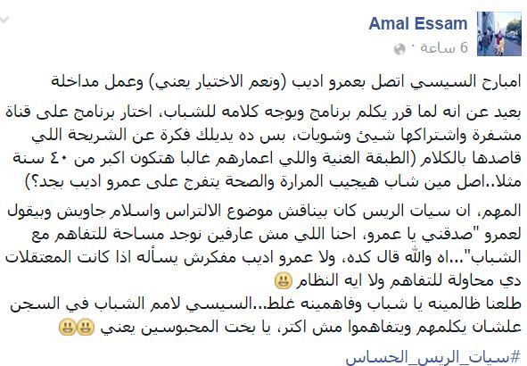 – أمل عصام: “امبارح السيسي اتصل بعمرو أديب (ونعم الاختيار يعني) وعمل مداخلة، بعيد عن أنه لما قرر يكلم برنامج ويوجه كلامه للشباب، اختار برنامج على قناة مشفرة واشتراكها شيء وشويات، بس ده يديلك فكرة عن الشريحة اللي قاصدها بالكلام هي الطبقة الغنية واللي أعمارهم غالبا هتكون أكبر من 40 سنة”.