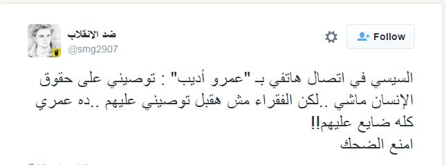 smg2907: “السيسي في اتصال هاتفي بـ”عمرو أديب”: توصيني على حقوق الإنسان ماشي.. لكن الفقراء مش هقبل توصيني عليهم.. ده عمري كله ضايع عليهم!! امنع الضحك”.